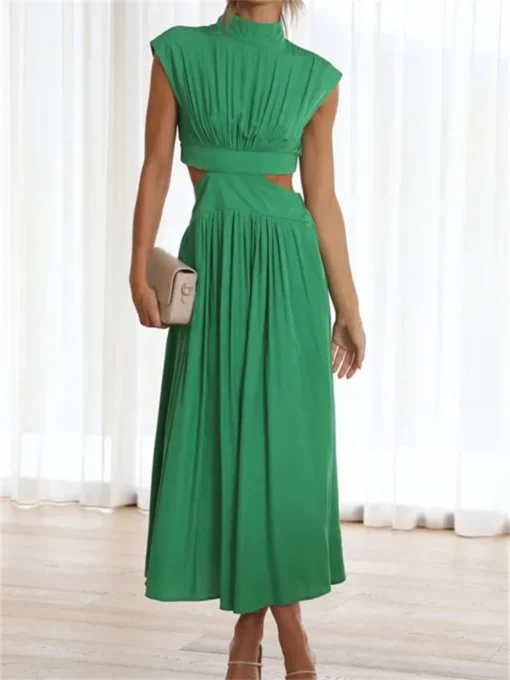 Women Summer Long Dress Solid Color Sleeveless Mock Neck Hollow Out A-line Dress Sexy Elegant Beach Holiday Loose Dresses