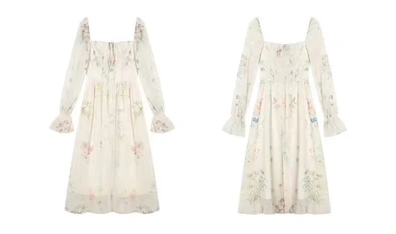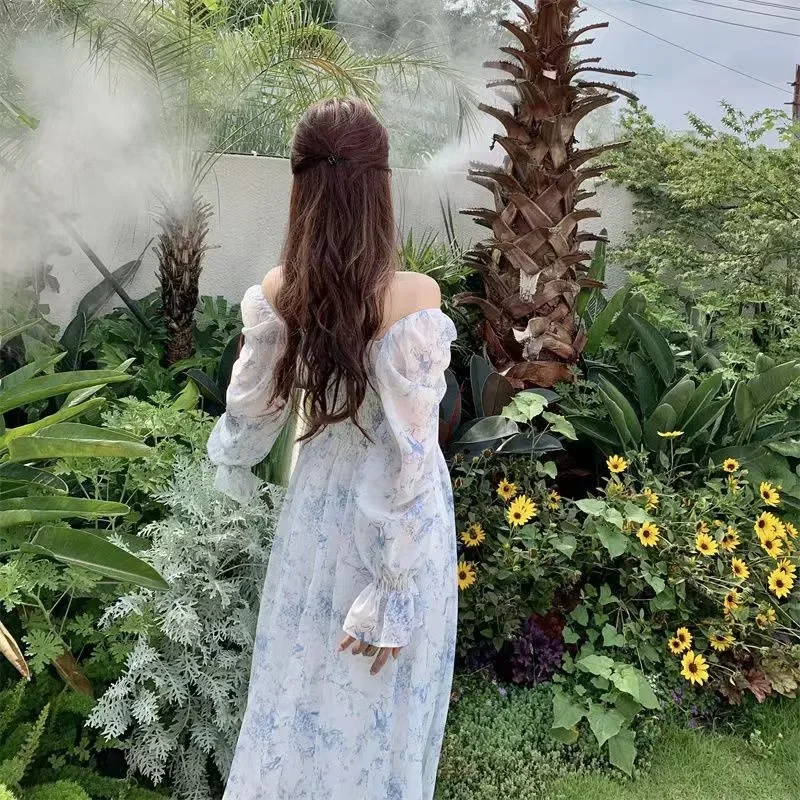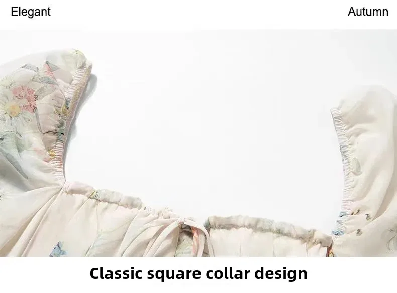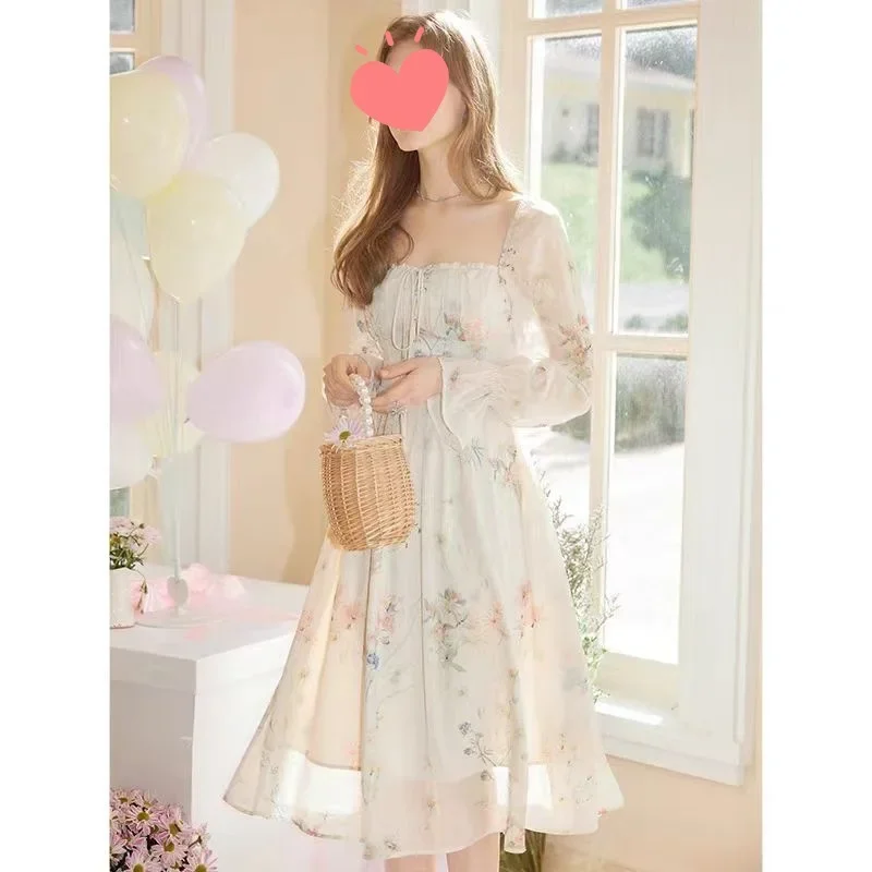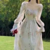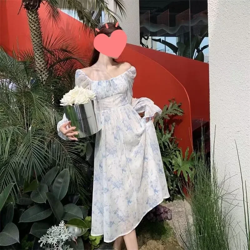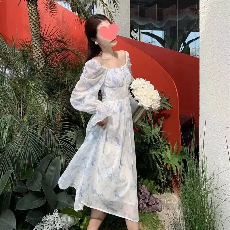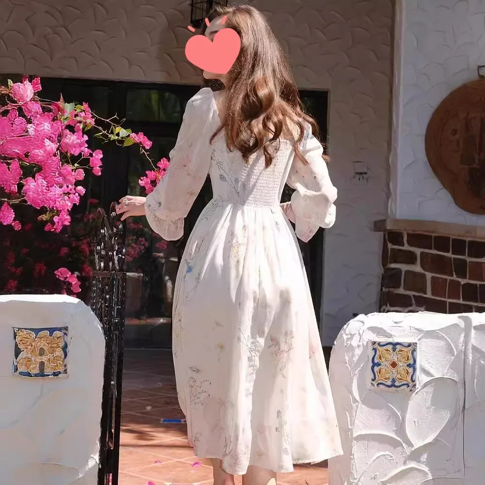 Elegant French Style Lantern Sleeve Long Dresses For Women 2024 Spring Summer New Waist-Fitted Fragrant Flower Dresses