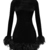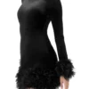 Women Bodycon Dress, Long Sleeve Crew Neck Feather Patchwork Slim Fit Mini Dress for Cocktail Party