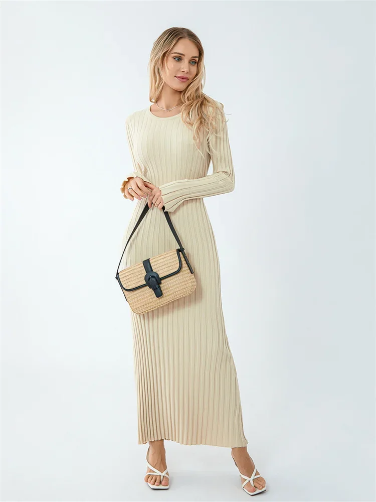 Women Knit Dress, Elegant Long Sleeve Crew Neck Ribbed Solid Fall Long Dress Streetwear