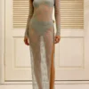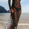 Womens See-Through Lace Dress, Long Sleeve Round Neck Slit Hem Dress Chemise Beach Vacation Party Wear
